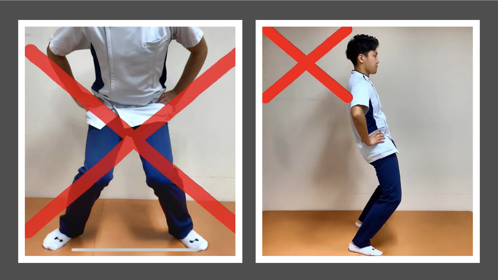 例えば、内股になったり(写真の左側)、膝だけ曲げてしまったり(写真の右側)してしまうことで、思うような効果が得られません。むしろ、膝などを痛めてしまうことがあります。